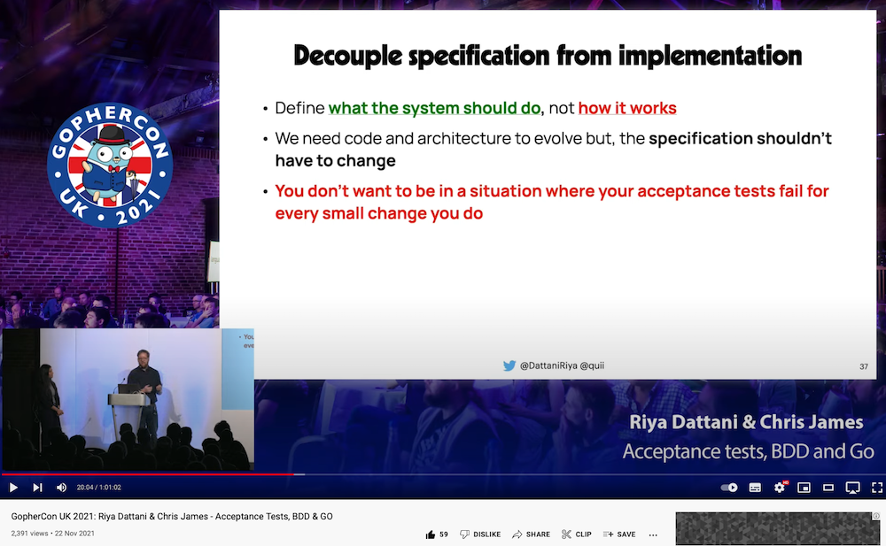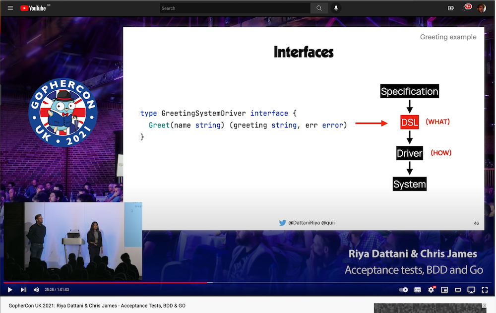 Finally, Riya Dattani and I spoke about this topic in the context of BDD in our talk, Acceptance tests, BDD and Go.